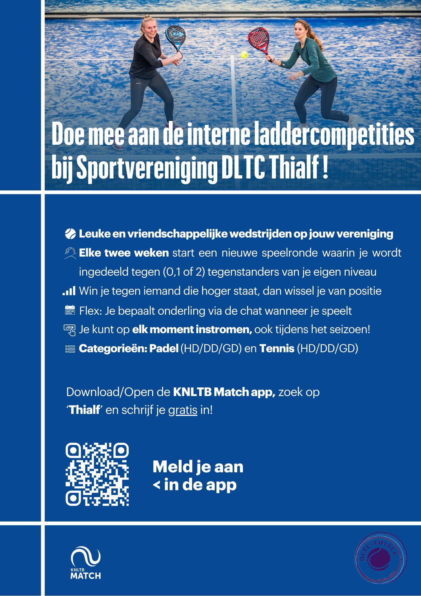 De voorjaar ladder voor zowel de tennis als de padel gaat bijna starten! Dit is de enige competitie waarin je zelf bepaalt wanneer je speelt, dus het komt altijd uit. Bovendien speel je altijd thuis, en leer je nieuwe spelers kennen binnen de vereniging van jouw niveau.